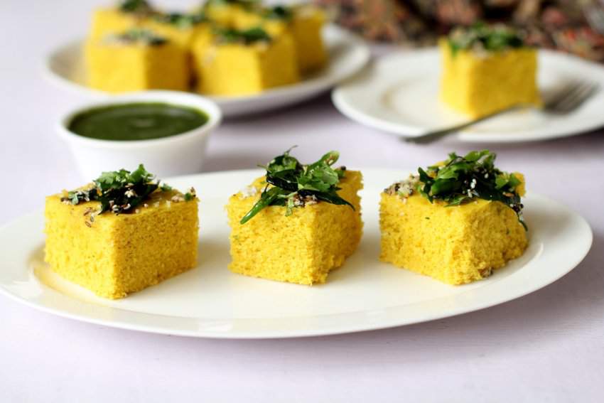 Dhokla is a Vegetarian spicy and tasty snacks of India. It is prepared with rice and chickpeas. Mix the chickpeas with the fermented rice batter and steamed. Another side prepares a sweet juice with lemon and sugar then pour on the steamed Dhokla. Then garnished with mustard seeds and coriander. The taste is savoury and sweet.